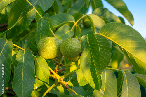 Unripe Fruits Of Common Walnut On The Branch Among Foliage